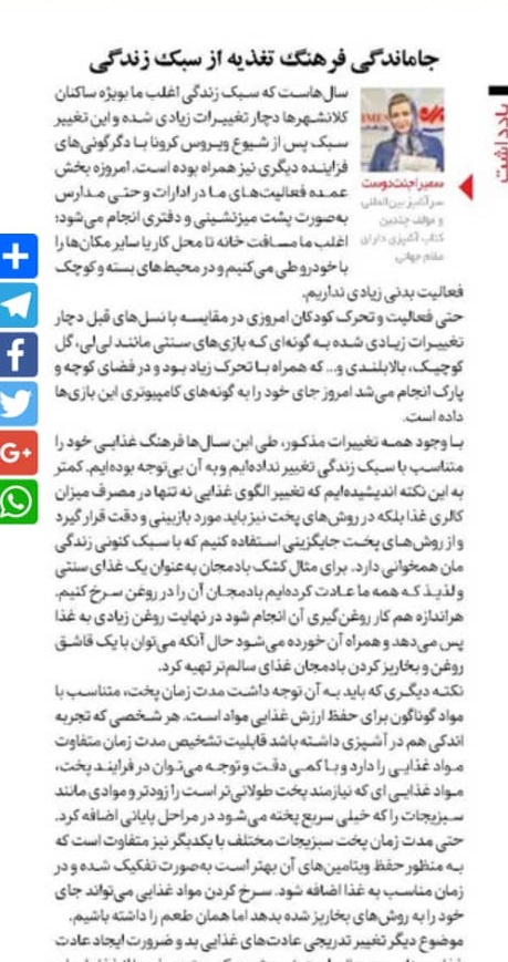 ضرورت تغییر عادات غذایی متناسب با سبک زندگی امروزی یکی از موضوعات مهمی است که از آن غفلت شده؛ سمیرا جنتدوست در قالب یادداشتی که در صفحه ۵ شماره روز اول خرداد ۱۴۰۰ روزنامه ایران به چاپ رسید به این موضوع پرداخته است.